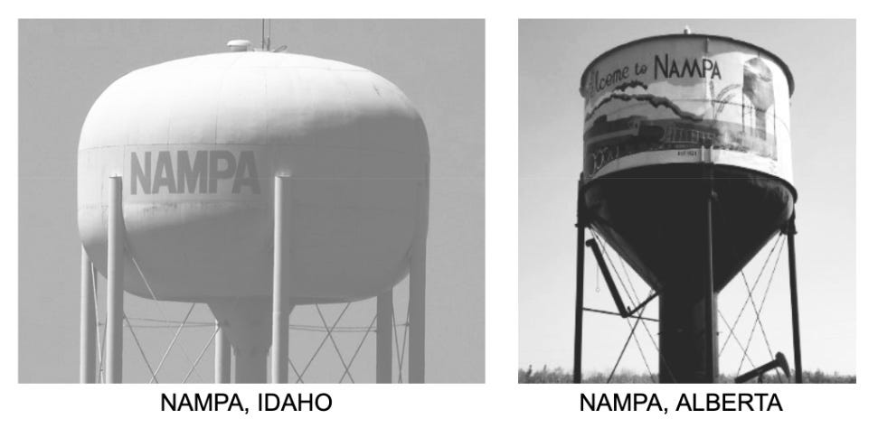 See also: NYSAA, in Oregon… And, also-also, for an interesting compare-and-contrast see Nampa, Alberta, Canada — 1400 miles due north from Nampa, Idaho, USA: The town’s origins are remarkably similar (non-flag-ship RR town founded by Land-Improvement Co. working in cahoots with the RR Co.). It just didn’t have the good fortune of being born between a Boise and a Caldwell. Its about a 2 ½ now. The wikipedia page says “an indigenous word meaning The Place”, but the local librarian is not so sure about that.3