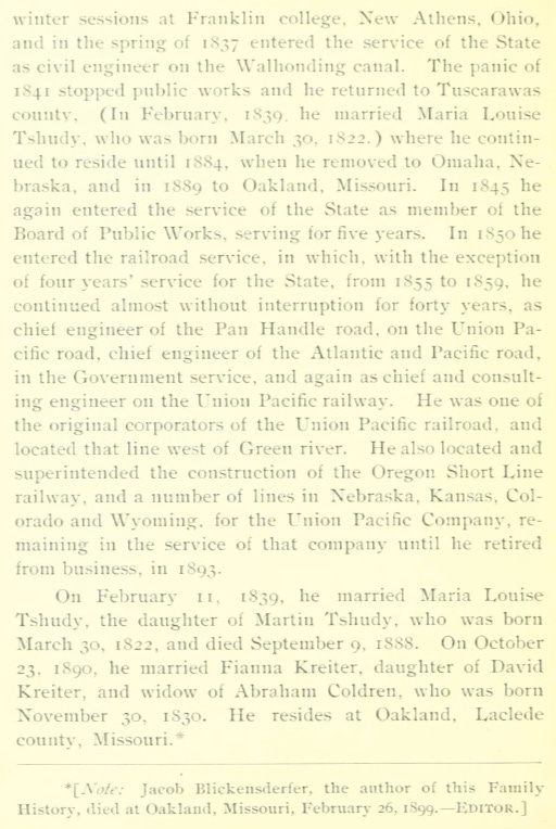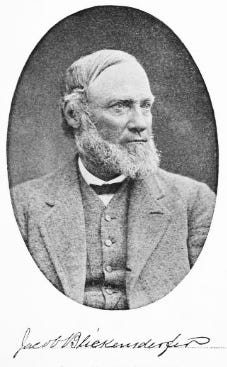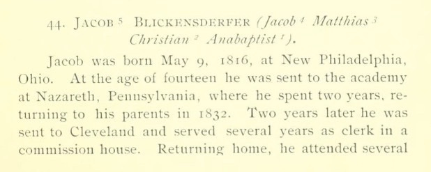 Jacob BLICKENSDERFER was descended from Christian. He was a precise and mathematical man — was briefly mentioned in Lukas’ Big Trouble (1997) as a “stolid Dutchman”. His History of the Blickensderfer Family in America, for example, is perfect. Here is the entry he wrote on himself: