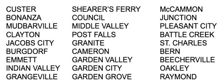 See Idaho Towns named in the initial rushes of the 1860’s: SILVER CITY, RUBY CITY, IDAHO CITY, ORO FINO, ORO GRANDE, PEIRCE, DeLAMAR, ROCKY BAR, QUARTZBURG, PLACERVILLE, CRYSTAL, ATLANTA, DIXIE, etc.. More mining towns named after metals, white prospectors, and confederate stuff… This all joining some earlier French non-town names from the fur-times: PORTNEUF RIVER, PAYETTE RIVER, BOISE RIVER, LAKE COEUR D’ALENE, LAKE PEND D'OREILLES — some early American Names: FORT HALL, FORT HENRY, AMERICAN FALLS, BEER SPRINGS — some Early Mormon Settlements: FORT LEMHI, FRANKLIN, PARIS — Etc..