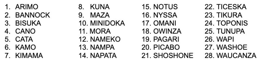 A few of these (BANNOCK, SHOSHONE, WASHOE) were recognizable. They were, and still are, names of familiar Native American Tribes. The other 25, though, were not recognizable. People generally assumed they must be “Indian Names”. People did not know what they meant.