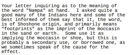 Already by 1911 the locals were “beginning to defile the name by ascribing to it putrid definitions and vile epithets in unfamiliar tongues”. Resident F.G. Cottingham took it upon himself to remedy the situation. He wrote to the US Indian Agents at Fort Hall and Duck Valley, asking if there was a Shoshoni word that sounded something like “Nampa”. Evan W. Estrep, from Fort Hall, replied:I am not able to find the meaning of the word ‘Nampa’, although the Indians seem to think it is a Shoshone word, Namb, a word very similar in sound, means ‘moccasin’.