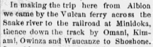 John Hailey, then librarian of the Idaho State Historical society wrote on 6 July 1915 that a Mr. Blinkingdoffer, chief engineer of the railroad, said he deliberately chose Indian names for the sidings and stations to avoid conflict with the names on other railroads.
