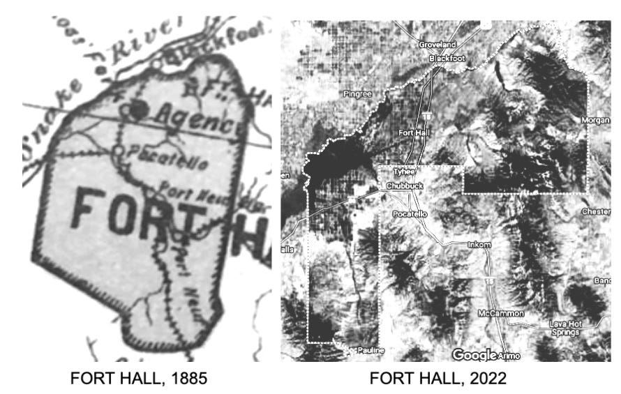 Note the location of Pocatello on both these maps — the other “Indian Names” (INKOM, ARIMO, TYHEE) which have emerged on the recent map, in the area that is not anymore contained inside the boundaries of FORT HALL….))))