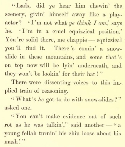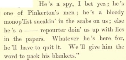 Also, to be clear: I don’t think this question has much to do with any question about the authenticity of Foote’s North Idaho Miner Talk. Regardless of the particulars, regardless of her “ear” for it, I think she has a good “idea” of it. And this idea would’ve been learned through some experience, too… I think of the famous Tolstoy line about happy families and unhappy families… Same difference: All mine-owners are coming from the same town (= the town where all the Cosmopolitans are citizens of). All miners, meanwhile, are coming from different towns — are speaking differently from each other… This is the whole romance of Coeur D’Alene (1894): The wilds of Idaho are the tunnels of Babel — a dark and vernacular disaster-area through which two mine-owners from different continents discover that they are speaking the same language — the language of the surface of the earth, of the daylight, of reason, civilization, good manners, and etc… Though not especially believable as a Romance, the underworld vernacular here comes off good. To accomplish this, I guess, Foote’s focus was less the specifics of Miner Talk, more the diversity, the distinctness, the vagueness, the weirdness of Miner’s Talk.