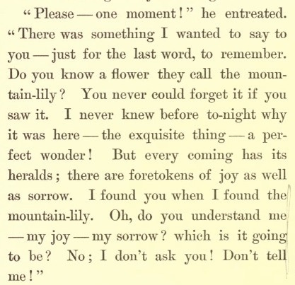 Second Chapter is called “An Equivocal Position”: Back at the Mine Manager’s residence, the servants and their miner-friends are whispering in the shadows outside, not smoking, being secretive. Then the two polite ones from the cabin arrive out of the woods. They converse in the moonlight, unaware they are being overheard. Having successfully navigated the challenges of the previous chapter, they are in love now. (“Life on the Frontier”, Foote notes, “is remarkably productive of such perilous short-cuts to sudden intimacy”.) They are parting politely when the man from London outbursts:
