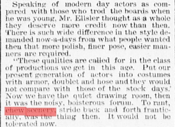 Sixth: “He was said to chew the scenery”... This vague and weird story (as reprinted in 1884 Dallas and 1885 Wichita) is the earliest instance I can find of any “chewing the scenery”.