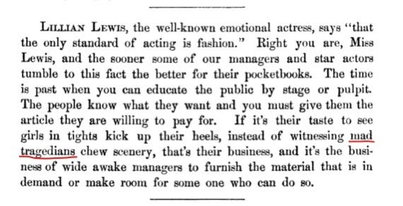 A good analogy is the microphone — how, with the microphone, the stage-singer does not need to manually project their voice to the back of the room anymore — can whisper through the microphone to the back of the room now, Sinatra-style…. So says Ellser, “easier manners are required”: The difference between old and new styles is the difference between operatic and crooning styles. The “scene chewer” means the hangover of the manually-projected style — means the one who is now singing operatically into the microphone — the one who is now shouting into the microphone — the one whose facial contortions and wild gesticulations, necessary to cut through the former dimness, are over-amplified through the new light.
