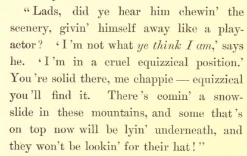 Note: I’ve read that Foote had a good “ear” for everyday talk in Late 19th Century Idaho. I’m not sure, though, that that’s entirely what’s going on here... Or in other words: I don’t think Foote is reproducing Late 19th Century Idaho’s Miner-Vernacular in the same way we, on the opposite side of the 20th Century, imagine authors reproducing vernaculars. We imagine authors of vernaculars working bottom to the top — gathering quirks and particulars from a particularly quirky vernacular, assembling them into dialogue and, in this way, making a bigger picture. We read a weird phrase in a book about Late 19th Century Idaho, written by a Late 19th Century Idaho author, and we assume that the weird phrase is from Late 19th Century Idaho, more or less — either originated there, or at least passed through somewhere within earshot of the author…. In this way, we imagine the author listening. We do not imagine them doing that other thing authors tend to do, which is reading. And the difference would be especially outstanding in Late 19th Century Idaho — and then even more for a Victorian Gentlewoman here. Excluding the Idaho Statesman, none of Foote’s reading material would’ve been coming from Idaho.