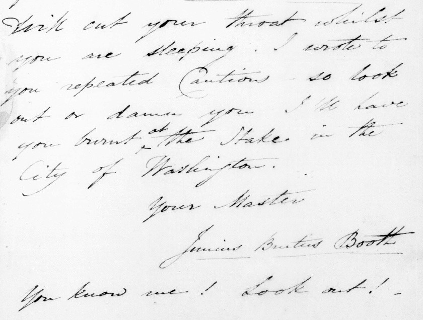 ((Reads:...will cut your throat whilst you are sleeping. I wrote to you repeated Cautions — so look out or damn you. I’ll have you burnt at the stake in the City of Washington. — Your Master, Junius Brutus Booth — You know me ! Look out ! ))