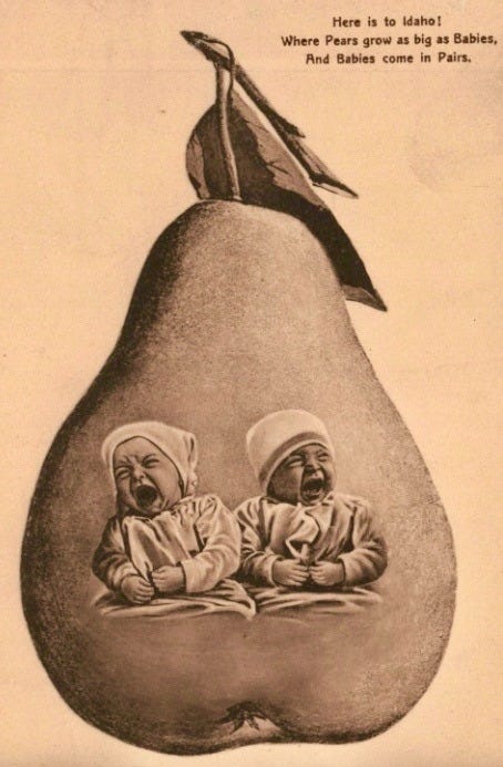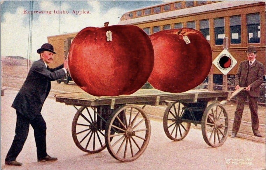 NOTE (D): …to glisten with the tempting juice of health and freshness… It makes sense that, for contrast, Boosters would want to emphasize the fruitiness of the “New West”. Basic color-theory tells us that, against a sagebrush backdrop, a red apple pops much better than a potato.