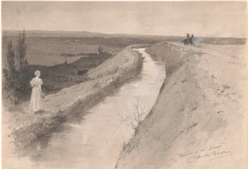 NOTE: (B2): …split down the middle…. See this drawing from Mary Hallock Foote, published in “Conquest of Arid America”, Century Magazine, 05/1895, where the line is literally the irrigation ditch, “Between the Desert and the Sown”: