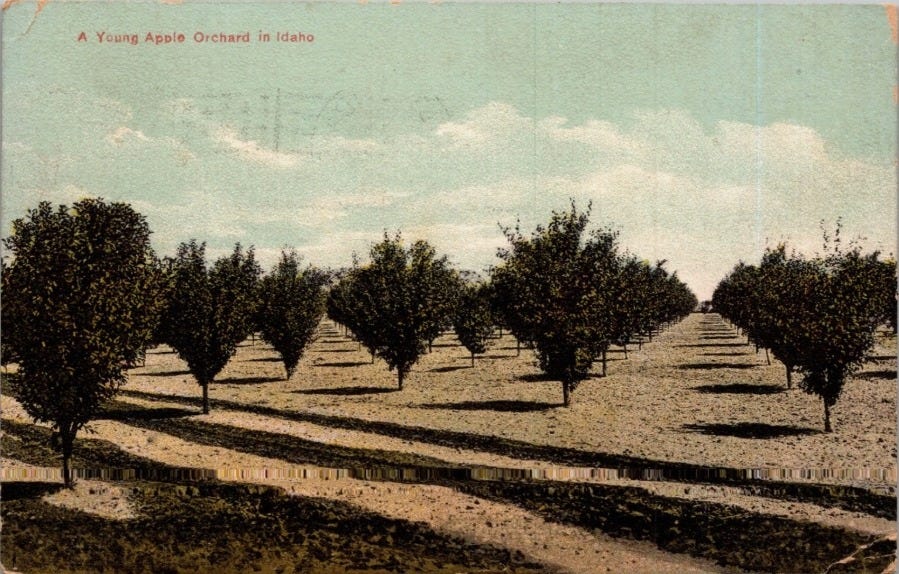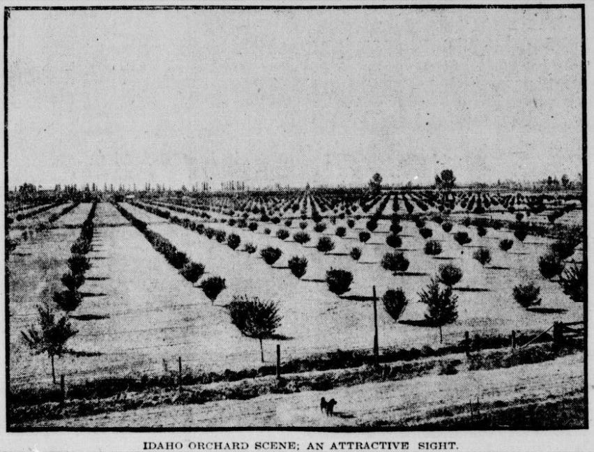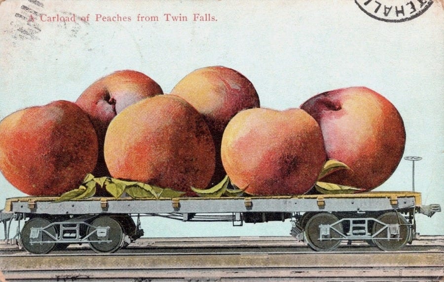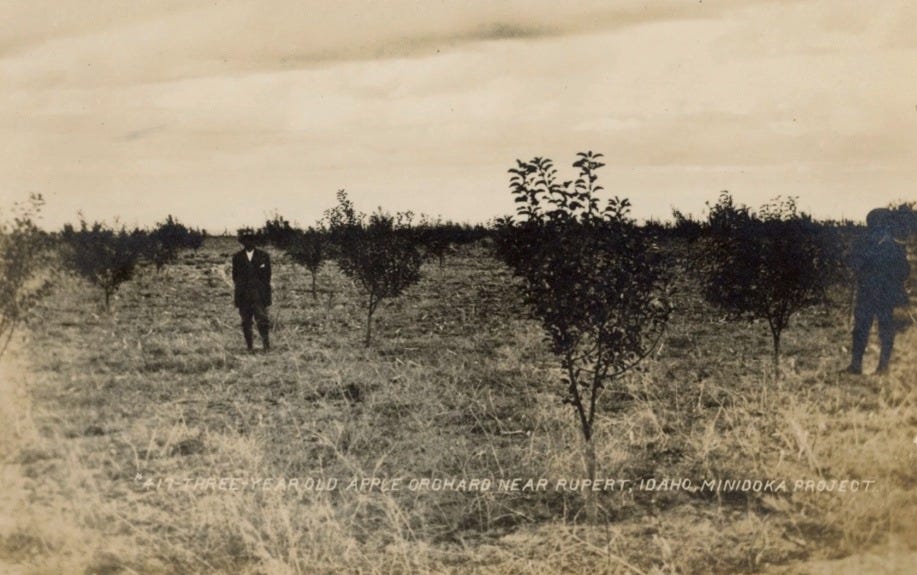 See Like: Since 15,000 years ago when it was cut so deep by the Bonneville Flood, the Snake River has tended to not share its water with its Plain. And still non-hydrated through its new “Iron Veins of Civilization”, the on-coming cultivation of the Snake River Plain requires lots of Irrigation… First waves of grand-scale Irrigation (1883 to about WW1) follow the arrival of the RR, but precede the Potato... The pre-Potato idea for the Snake River Plain is Fruit — is an irrigated garden productive of very big Fruit.