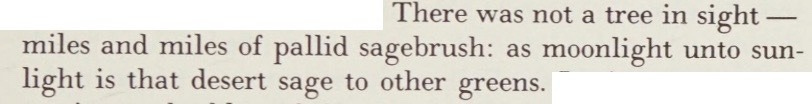 NOTE (B): …the skin shows through the glass… It is hard to see anymore the beauty we once saw in irrigation. Mark Fiege, in his Irrigated Eden (1999), points this out: Where we nowadays tend to look to the beauty of the untaintedness of the wilderness beyond our irrigated landscape, the old settlers and boosters were more-fascinated by the line that separates the two — luscious farm-moistness to the left / desert waste-grey and sagebrush to the right.