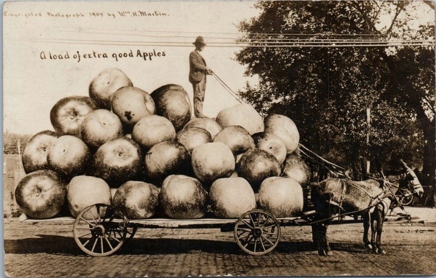 Good to see the pre cursor of Ai/photoshop constructed images goes back a long ways. People have always loved “larger than life” possibilities. Fruit seems to be a big target for this enhancement. We did a lot of design work for growers in California like SunMaid raisins and Diamond Walnuts throughout the 90s. There was one particular report in which we replicated old fruit crate labels with GIANT produce.