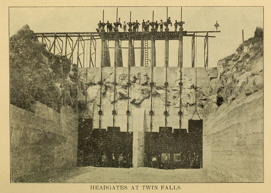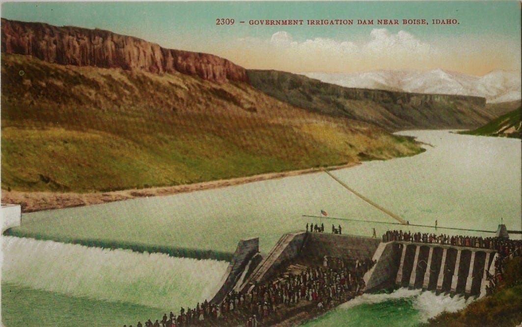 Or see this postcard, produced by Edward Mitchell in San Francisco, 1909, depicting opening day festivities for the long-coming Boise River Diversion Dam, as the line re-originates in this split between “Boise River” and “New York Canal”: