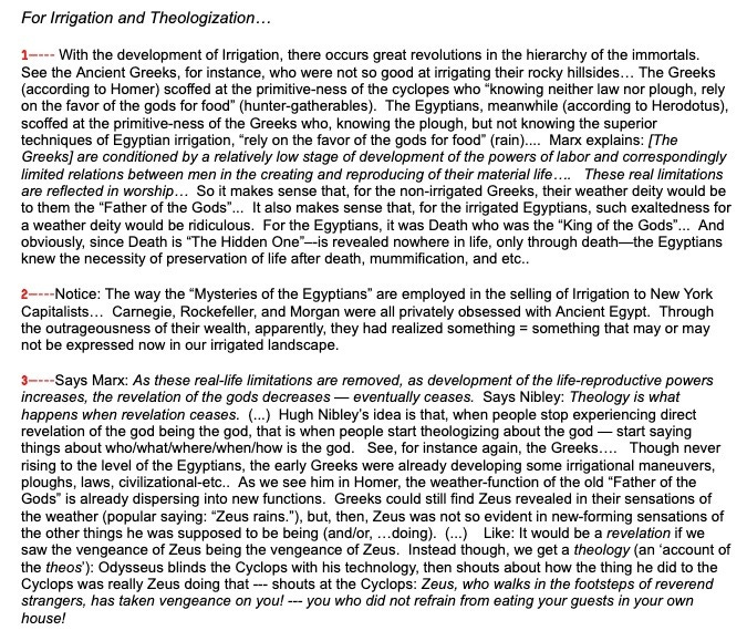 Then reconsider my old notes for my old book on tape, Irrigation and Theologization (1993):