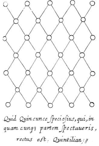 For the best book about quincunxes, see Sir Thomas Browne’s The Garden of Cyrus, or, The Quincuncial Lozenge, or, Network Plantations of the Ancients Artifically, Naturally, and Mystically Consider’d (1658).... Here, Brown considers the quincunx, “artificially, naturally, and mystically”, as he traces the configuration’s diffusion from the quincunxial Gardens of Paradise, into the networked orchards of the ancients, into various patterns in Nature, into the animals, into the most-basic infrastructure of animal vision…