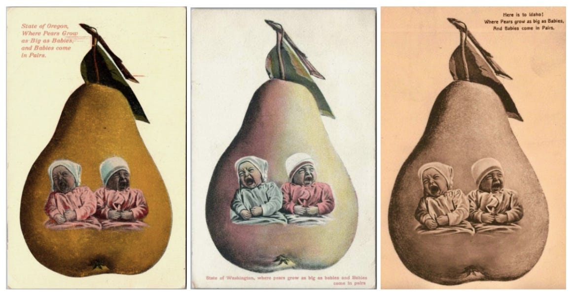 Some question whether this is the original…. Image and text are reproduced and colorized in postcards for both Washington and Oregon.